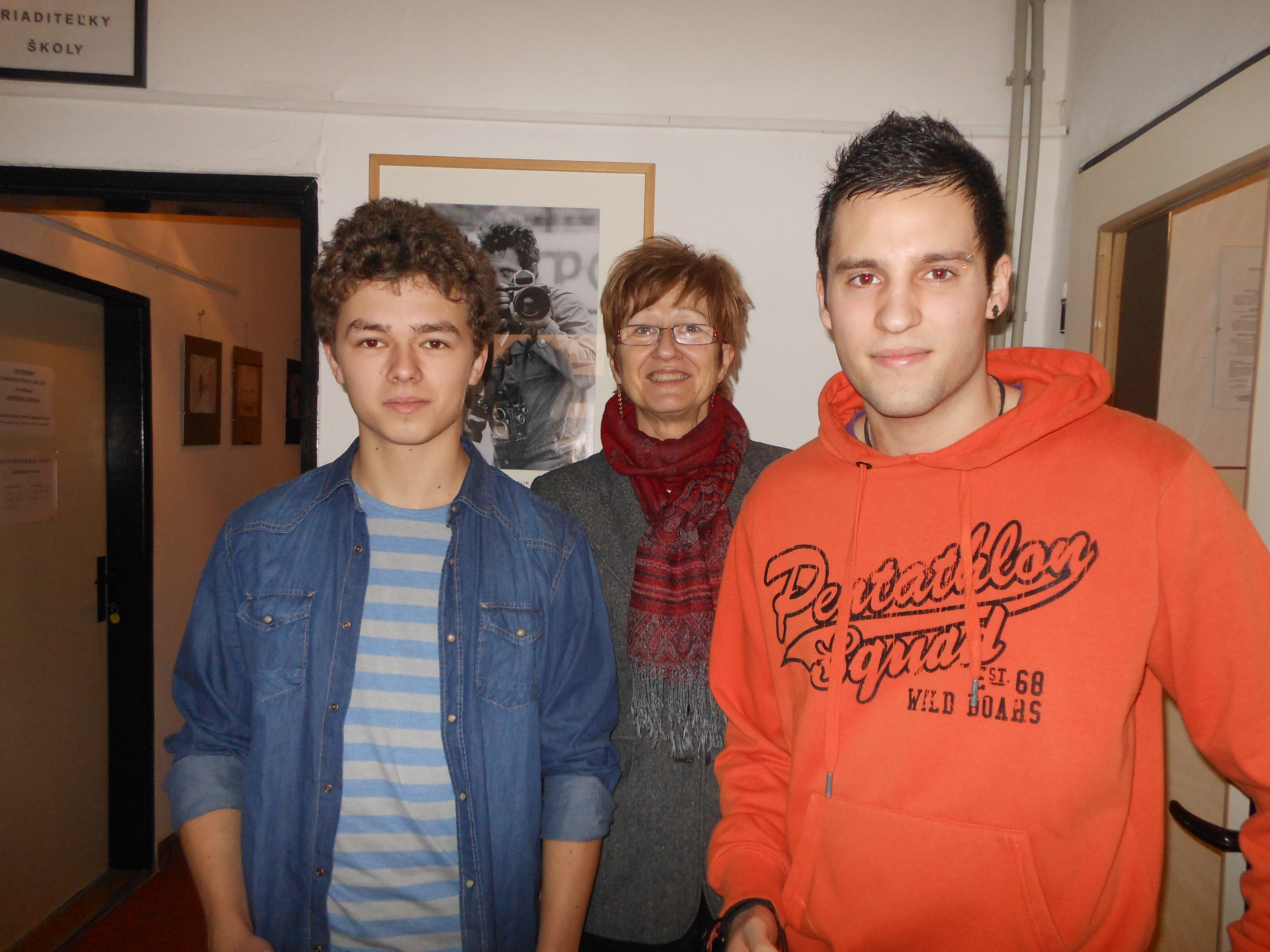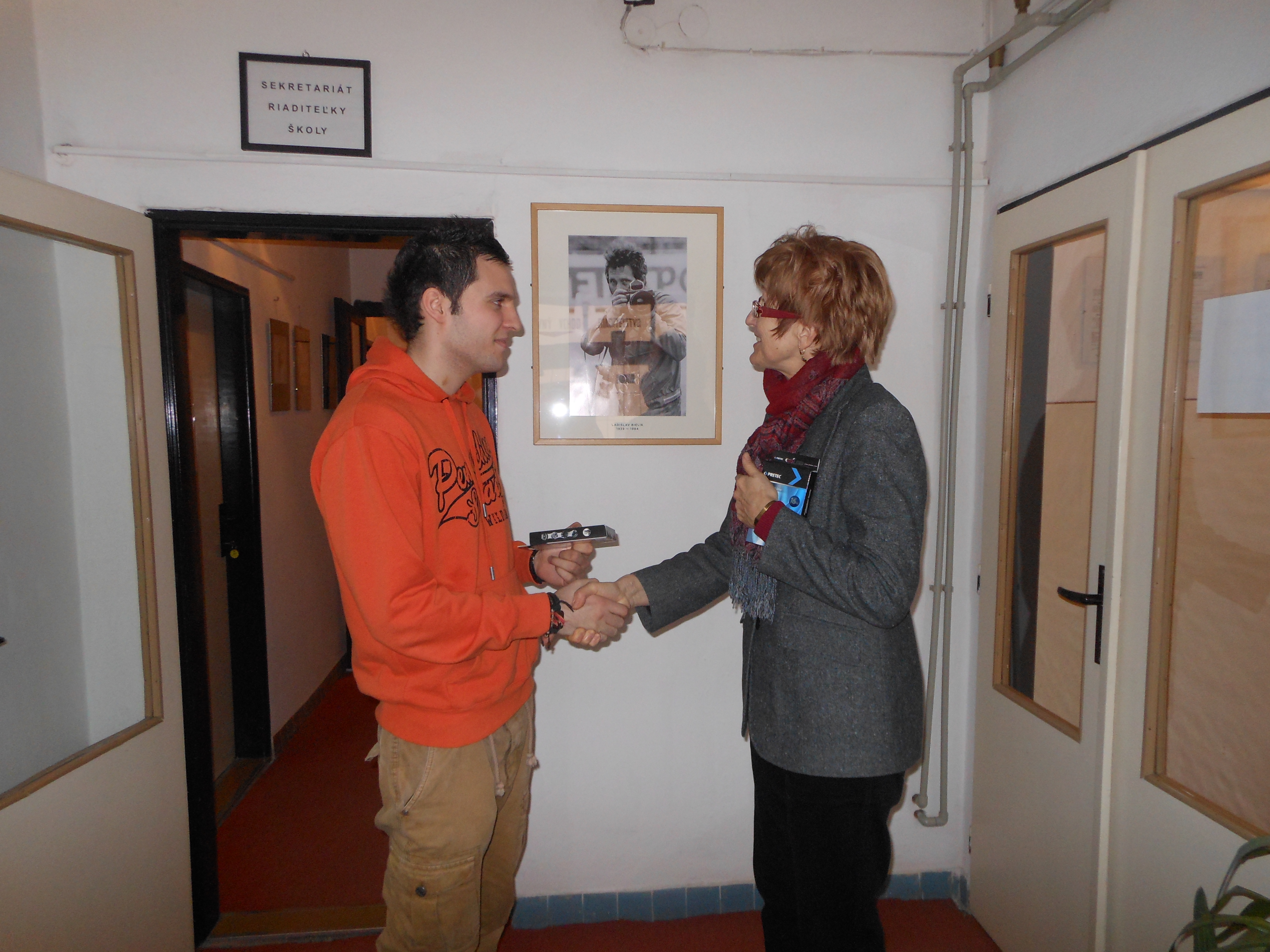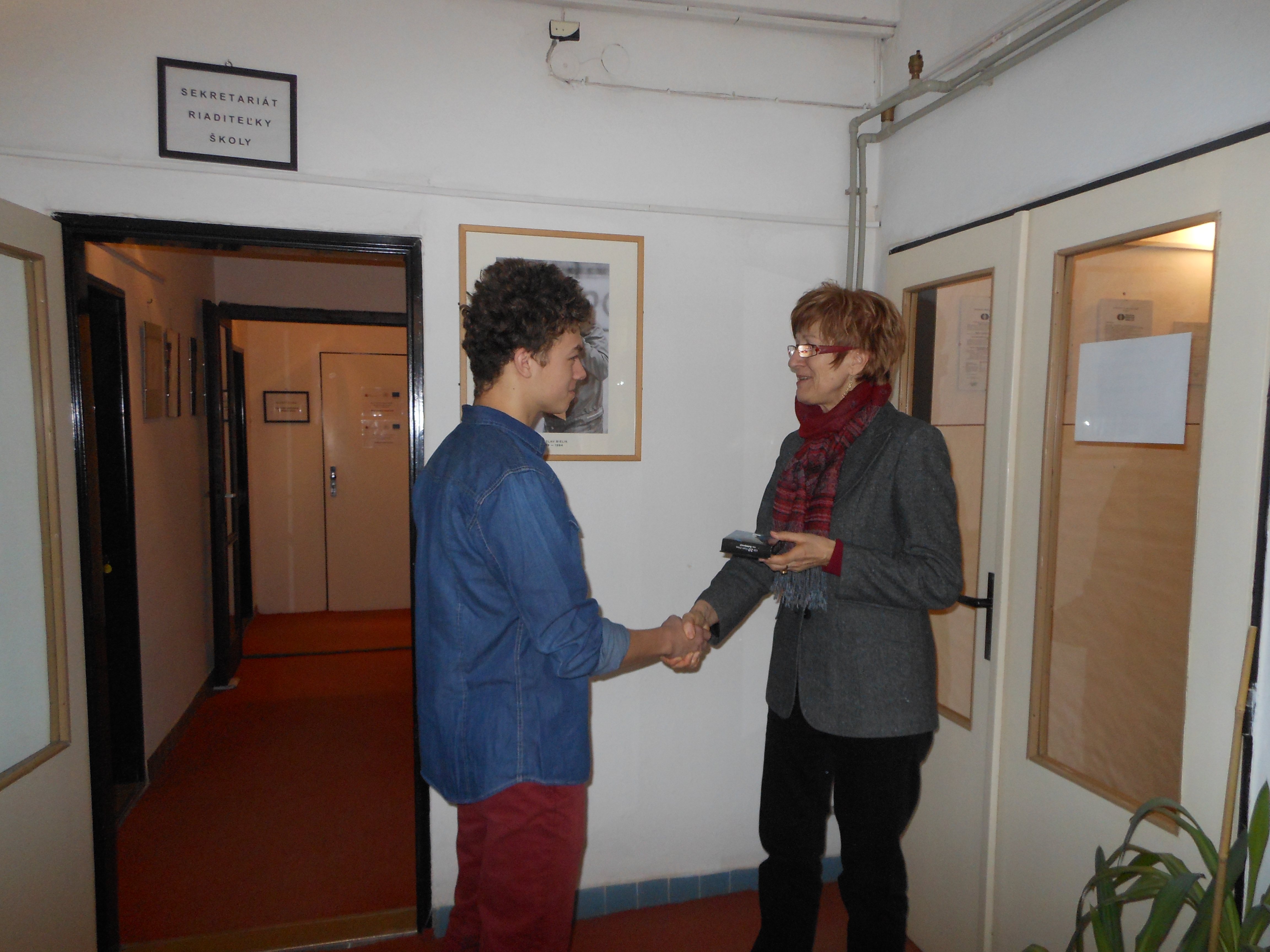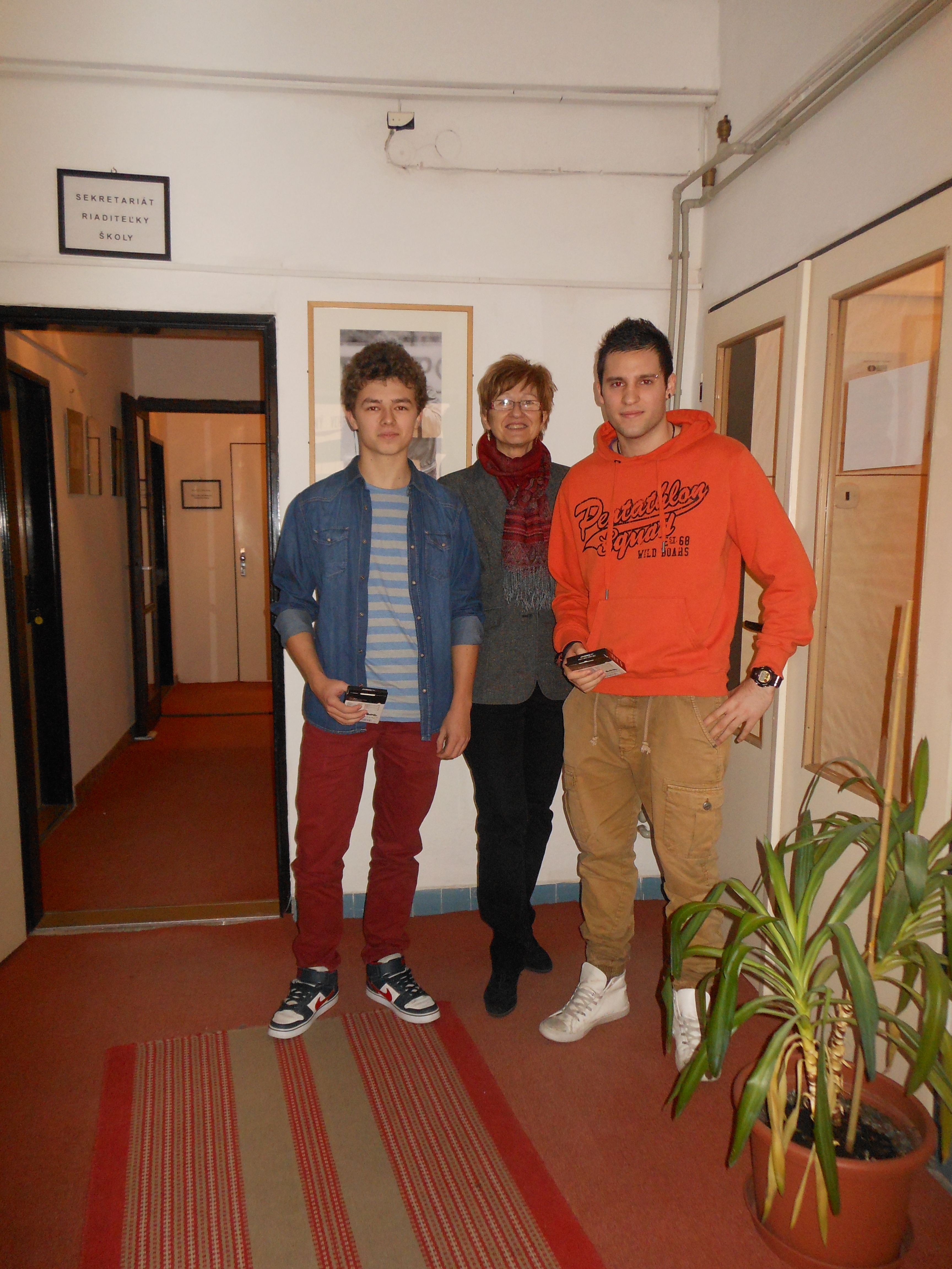On the occasion of biannual evaluations on 30.01.2015 headmistress Ing. Lívia Jančoková handed over the award in the form of USB drives to students III.GV class Viliam Lavička and Peter Minárik 1st place in the school round development of a logo for an international project Erasmus+ „Career in art“ and perfect representation in international round.